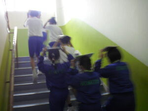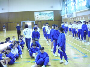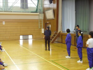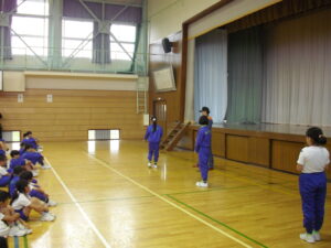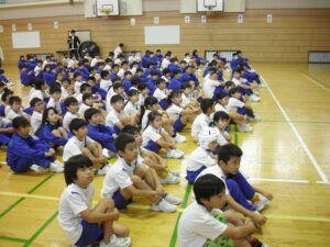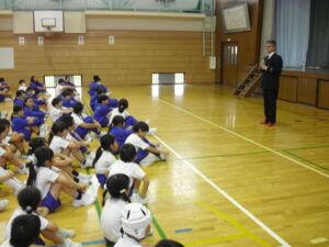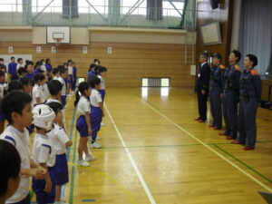10月8日(水)、地震対応の避難訓練を実施しました。大休憩の途中に訓練を開始しました。いつもは教室で机の下に頭を入れるのですが、休憩中のため周囲に危険なものがないか確認してその場で待機しました。雨天だったこともあり、体育館に避難しました。放送の指示をよく聞いて、落ち着いて行動していました。体育館では、消防署員の方から消火器の使い方をご指導いただいた後、児童代表と教員が実演しました。入善消防署長の笹原様をはじめ署員の皆様には、ご多用のところお越しいただきありがとうございました。