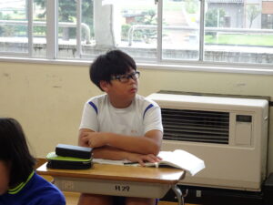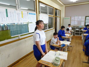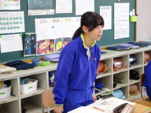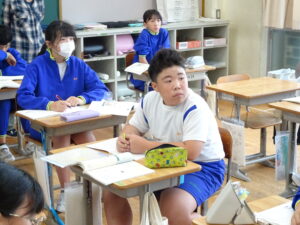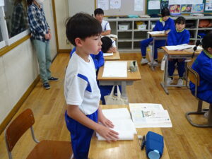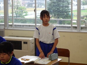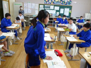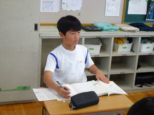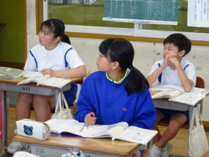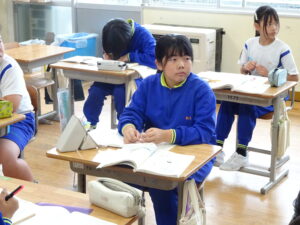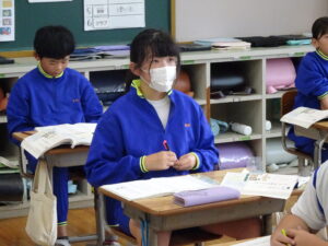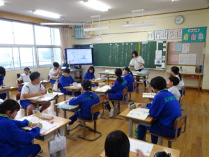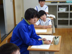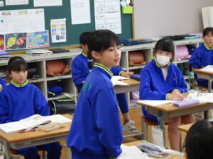 10月8日(水)、5年生が国語科で「よりよい学校生活のために」の学習をしています。この日の授業では、学習課題「学校生活をふり返って、話し合う議題を決めよう」に取り組みました。「そうじ場所をもっときれいにしたい」「ごみ拾い、整理整とんをしたい」「廊下を走らない人が増えてほしい」「いろんな人にあいさつする」などの意見が出ました。その後、意見を考えた理由を話し合いました。他の人の意見を聞いて、さらに意見を述べたり、考えを変えたりする人もいました。議題は「全校がいろんな人にあいさつするために できることは何か」になりました。活発に意見が出た話し合いになりました。