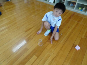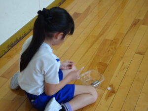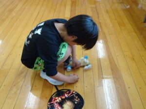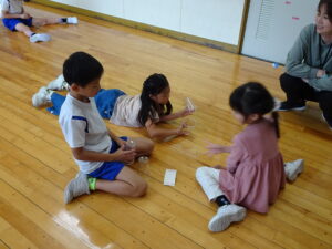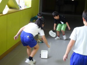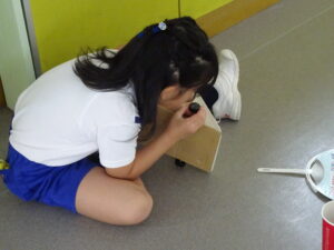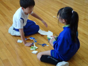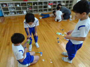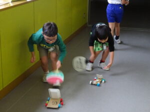 10月14日(火)、2年生は生活科で「わくわくうごく わたしのおもちゃ」の学習をしています。家からもちよった、さまざまな容器やペットボトルのキャップ、牛乳パックなどをもちいて、うごくおもちゃを製作しました。この日は、パワーアップをしようということで、ヨットカーを「もうすこし はやくしたい」、パッチンジャンプでは「牛にゅうパックを大きめに切る」などの意見が出ました。パワーアップできたかな。