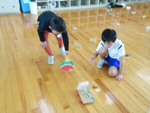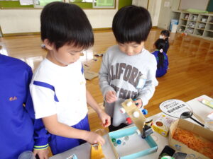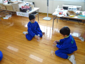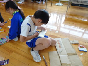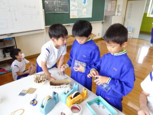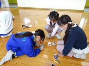 10月21日(火)、2年生が生活科でおもちゃづくりを続けています。「どうしたら高くとぶか、速く走るか」という思いをもって、おもちゃの改良をしました。一人で考えたり、友達と協力したりして活動しました。