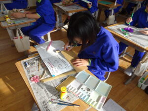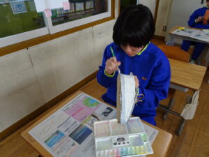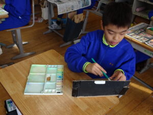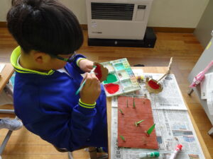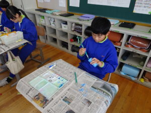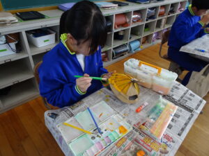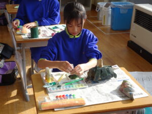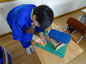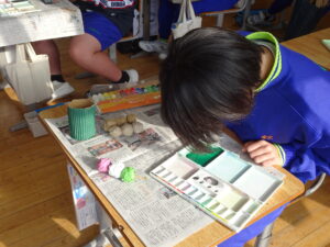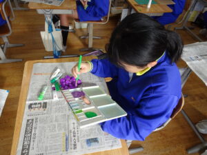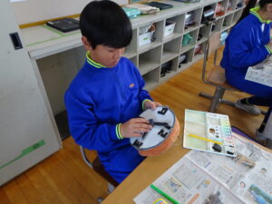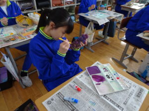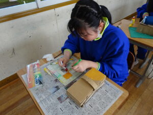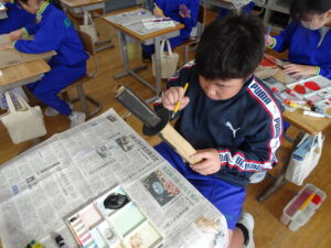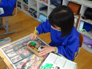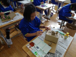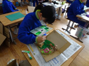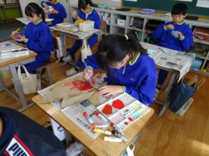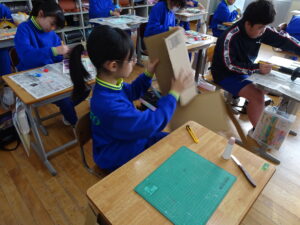 11月7日(金)、5年生が図画工作科で「だんボールで ためしてつくって」の作品を製作しています。だんボールを切ったり、曲げたり、はがしたりして思いついたものを作っています。絵の具で色を付けて仕上げに取りかかっていました。身近にある物や、くだもの、食べ物などつくっている物は様々です。工夫をこらした出来ばえに感心しました。