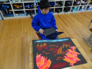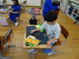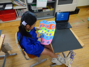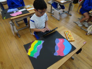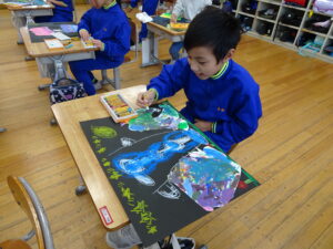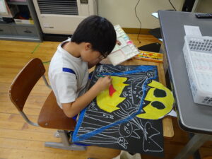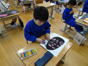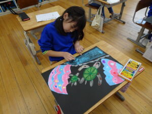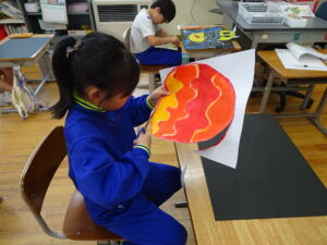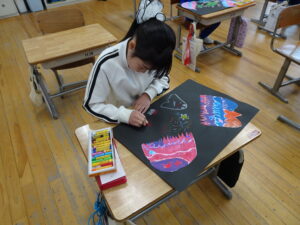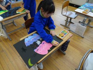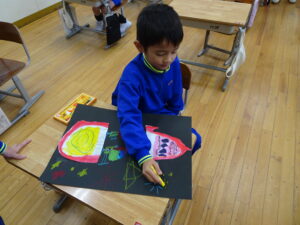 ふしぎなたまご 図画工作科2年生 11月10日(月)、2年生が図画工作科で「ふしぎなたまご」を製作しています。たまごを黒色の画用紙に貼り付けてクレヨンで絵を描いています。たまごの中から、いろいろなどうぶつが登場しました。とても楽しい作品になりそうです。