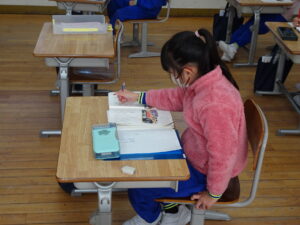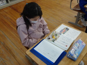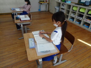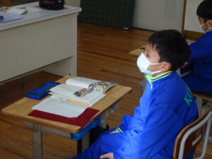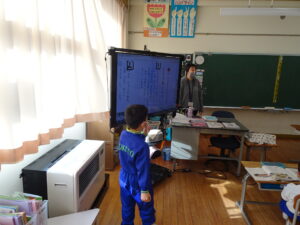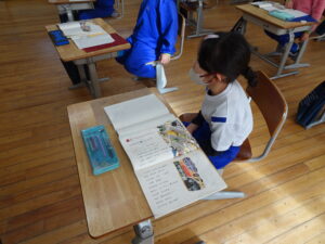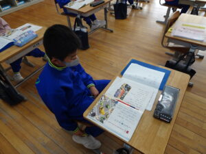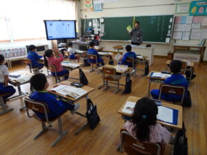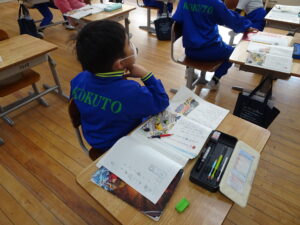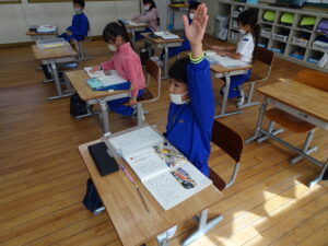 11月13日(木)、1年生が国語科で「じどう車くらべ」の学習をしています。これは説明文で、この日の授業では文章の中の「とい」をさがしていました。「どんな しごとをしていますか」や「どんな つくりになっていますか」という「とい」を見つけることができました。