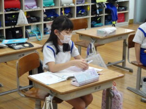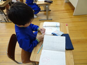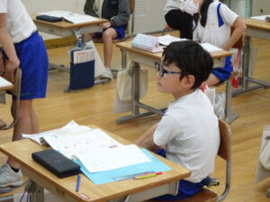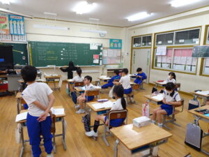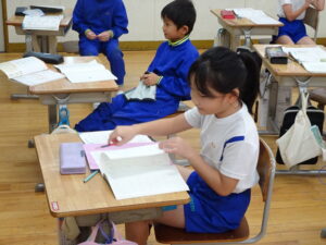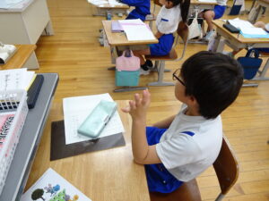 11月26日(水)、2年生が算数科で九九を学習しています。この日は、「8のだんの九九のつくり方をくふうしてかんがえよう」という画題に取り組みました。かけられる数とかける数を入れかえてもこたえは同じなので、「8✕4=32」は「4✕8=32」のように入れかえてみました。くふうして九九を考えています。
