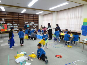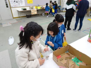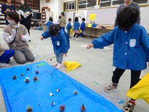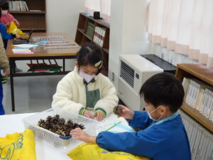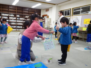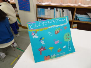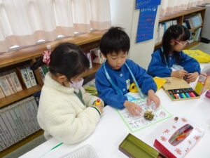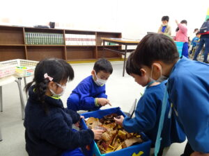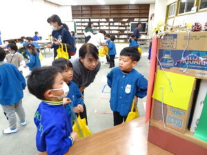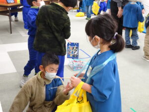 11月28日(金)、1年生がこあら保育所の年長児との交流会を行いました。1年生がこの日のために、「どんぐりころころゲーム」や「たからさがし」「さかなつり」「つくってたのしいかざりやさん」など、くふうをこらしたゲームやおみせを考えて準備しました。1年生は、お兄さん、お姉さんとして、ぶどう組さんの子供たちにルールを説明したり、やさしく教えたりして楽しく過ごしました。4月に、ぶどう組さんが入学してくるのが楽しみですね。