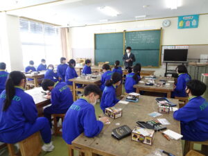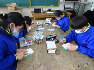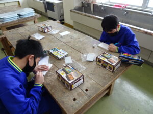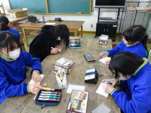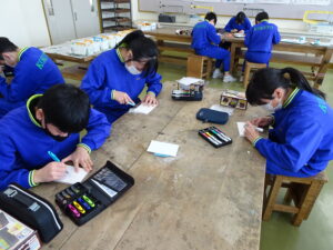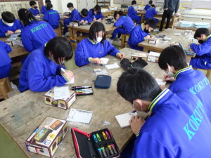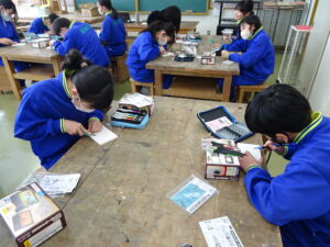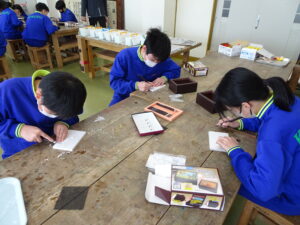 2月2日(月)、6年生が図画工作科で卒業に向けて作品を製作しています。ブラウンレザーボックスという小物入れの天板を作っています。天板は下絵を描いた後、彫刻刀で彫っていきます。思い出のある物をや卒業に関連した物を彫っています。天板には色を塗ってから、ニスでつやを出します。完成が楽しみですね。