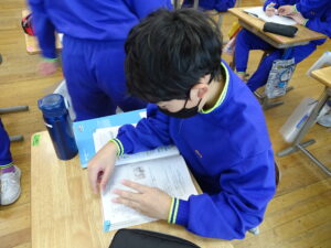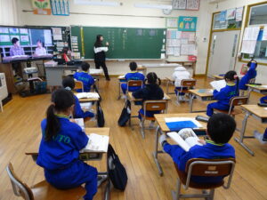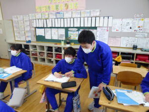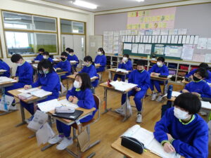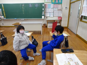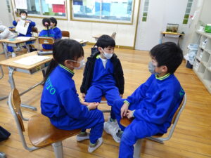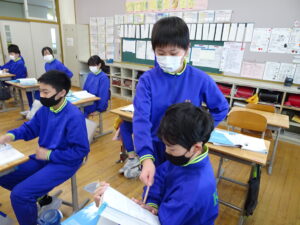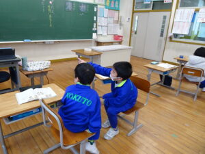 2月6日(金)、1年生が国語科で「これは、なんでしょう」の授業をしていました。ふたりで そうだんして、もんだいを かんがえ、もんだいを 出しあってたのしむがくしゅうです。ふたりで そうだんして、なにをもんだいにするか かんがえました。がっこうにあるものだと、こくばん、つくえ、いす、ランドセル、なにがいいかな。