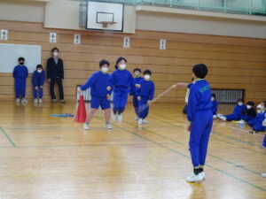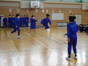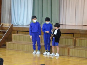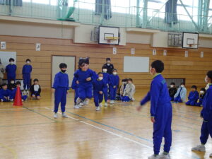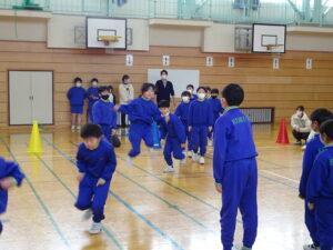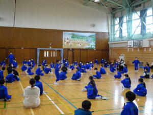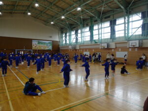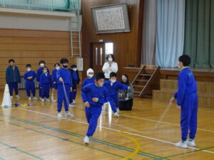 2月25日(水)、なわとび集会を行いました。冬の間の体力向上のために、練習に取り組んできました。学年ごとに八の字とびをしました。どの学年も全員でとぶことができました。次に、前とびの連続とびに取り組みました。全員が一斉にとびはじめて、どれだけ長くとべるか挑戦しました。最後までとんだ人は、かなり長い時間とんでいました。準備や進行を行った体育委員会の皆さん、ありがとうございました。