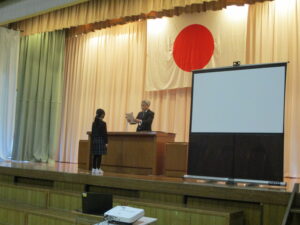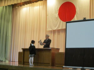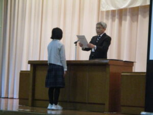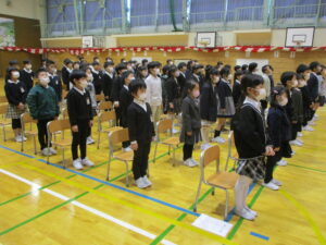 3月24日(火)、令和8年度の修了式が行われました。初めに、校長先生から児童代表に終了証が授与されました。式辞の中で、本多校長先生は「皆さん、一年間勉強に運動によく頑張りました。これからも自分の夢や目標に向かって、コツコツと努力を重ねましょう」と話されました。4月には進級します。楽しみですね。