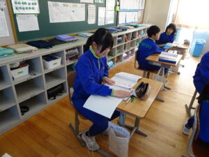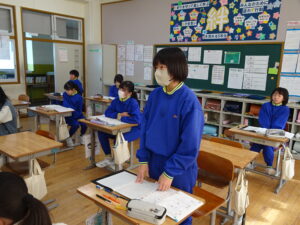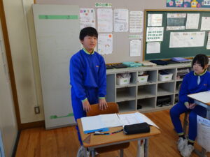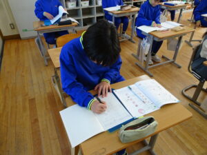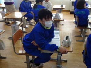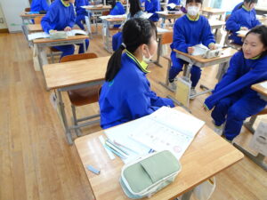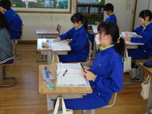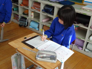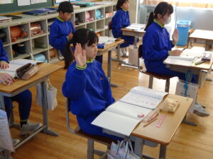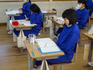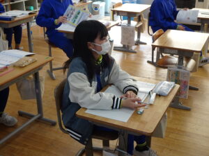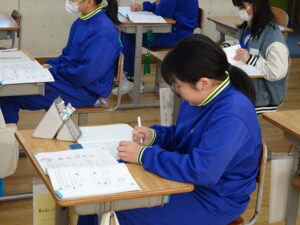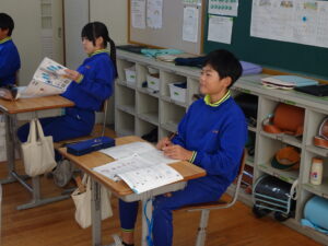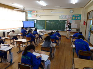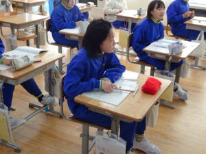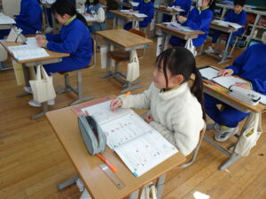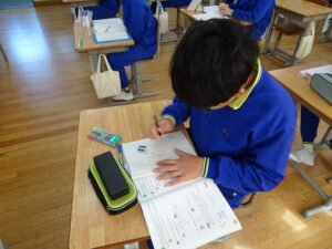 11月6日(木)、5年生が算数科で、分数と小数のまじった計算を学習していました。学習課題は「5分の2+0.3の計算のしかたを考えよう」です。分数か小数のどちらかにそろえて計算することで答えをもとめることがてきました。分数を小数にできないときは分数にそろえるとよいことも学習しました。