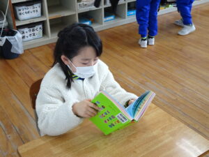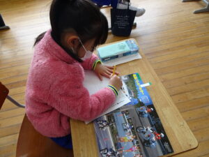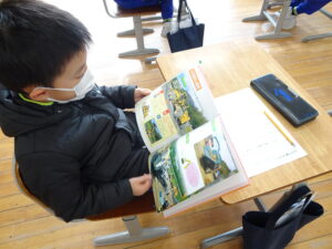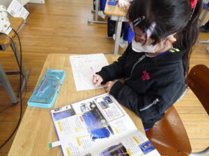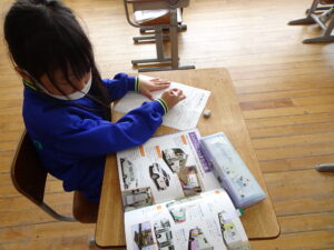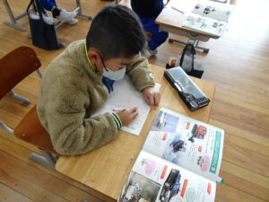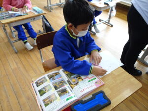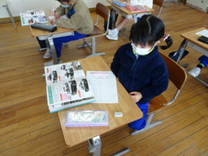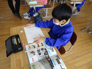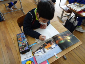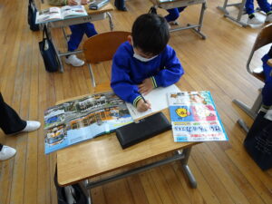 11月25日(火)、1年生が国語科で「じどう車くらべ」を学習しています。この日は、本を見ながら、どのようなしごとをしているかやじどう車のつくりを調べてまとめました。パワーショベルのしごとは「たてものをこわすしごとをしています」、つくりは「たかいところにまでのばすショベルがついています」などと本をみて書くことができました。
