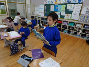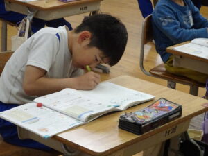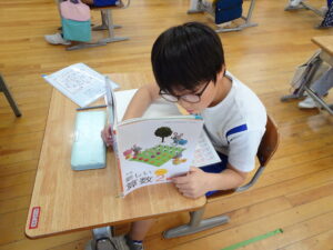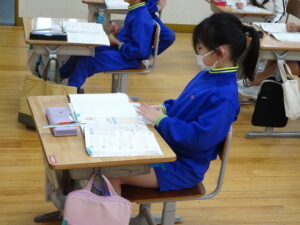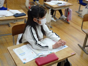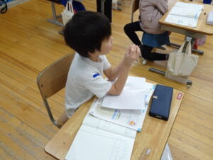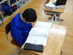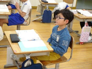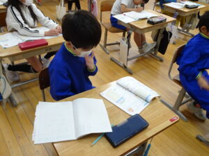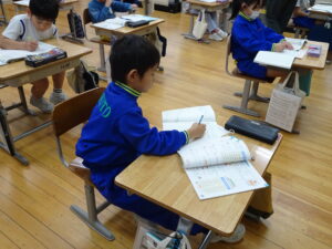 12月4日(木)、2年生が算数科でかけ算の九九を学習しています。この日は、学習課題「9✕8.8✕9のしきになるもんだいをつくろう」に取り組みました。「1日に▢ページずつ、本を読むと、▢日間で何ページ読むことに なりますか」という問題を考えました。8のだんや9のだんのかけ算はむずかしいので、じっくり取り組むとよいですね。