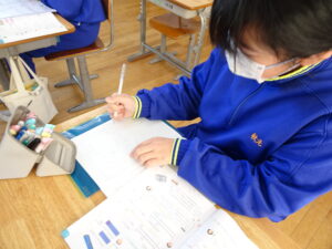 1月26日(月)、5年生が割合の学習をしています。学習課題は500円の筆箱に「30%加えたねだんの求め方を考えよう」です。500円の30%は、500✕0.3=150で650円という計算の仕方と、500円に30%加えた値段で、500✕(1+0.3)=650という計算の仕方があることを知りました。友達と2つの考え方を互いに説明し合いました。生活の中でも出てくる大切な計算の仕方を学習しましたね。