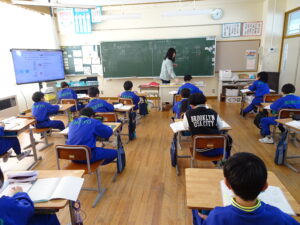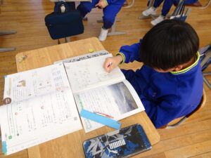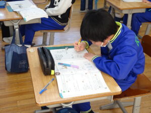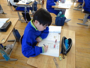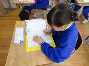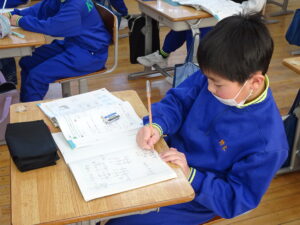 2月10日(火)、3年生が算数科の学習のしあげをしていました。かけ算の筆算のしあげでは、答えの見当をつけて計算していました。48✕32は、答えの見当をつけると、50✕30=1500になります。見当をつけてから筆算をするのですが、位のとり方に気を付けて計算しました。答えは1536になりました。