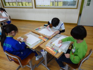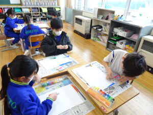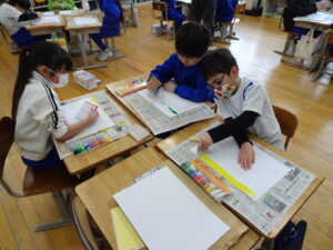2月25日(水)、2年生が図画工作科で「えのぐ ひっぱレインボー」に取り組んでいました。これは、絵のぐをのばして、かくことを楽しむことをめあてにしています。絵の具を画用紙に出して、段ボールの板を使って、絵の具を伸ばします。様々な色を伸ばして、虹のように仕上がるのが楽しみです。